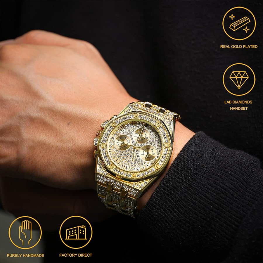 Some watches tell time. This one tells your story. Finished in real gold plating and detailed with sparkling lab diamonds, this watch is made for individuals who value bold style and timeless luxury. Whether worn daily or on special occasions, it adds confidence, class, and character to every moment.